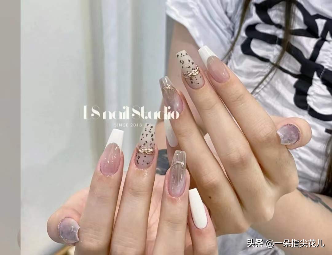第八款:冰透茶色打底,搭配弧形白色法式,跳指搭配白色钻球和立体歪心饰品。