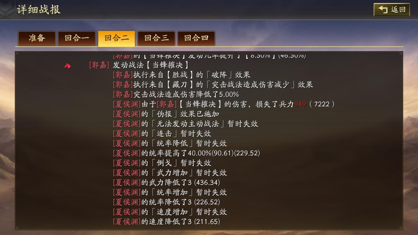 但是贾诩就不怕,这场对战渊骑战斗中,夏侯渊和郭嘉是满红,郭嘉还带有当锋,满红的郭嘉智力高,发动奇正相生几率就很高。虽然夏侯渊前两个回合不怕混乱,但是郭嘉会混乱,第二回合混乱的郭嘉,当锋催决直接打到夏侯渊了!导致夏侯渊连击和减伤都消失了。在第三第四回合对方全员混乱,郭嘉不出意外的又给夏侯渊上当锋了!缺少保护的夏侯渊,被贾诩两个回合打败,混乱出奇迹啊!