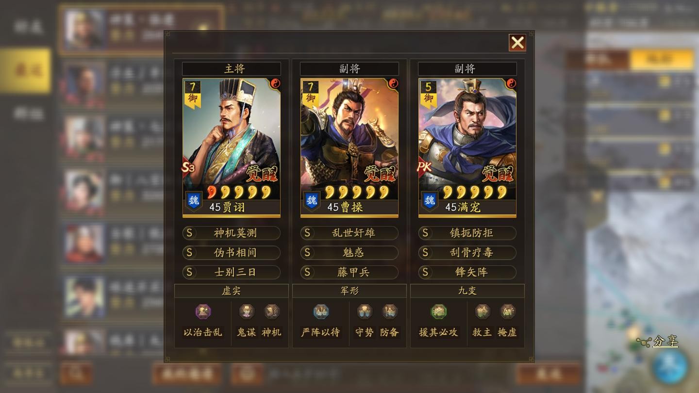 由贾诩 曹操 满宠组成的太尉盾,这个队伍特别适合白板玩家。