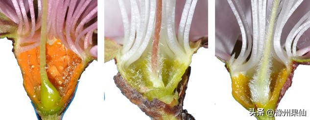 桃盛花期花药刚刚开裂时雌蕊的生长状态,包括有无、数量、粗细等。发育正常的雌蕊较长较粗壮,而发育不正常的雌蕊一般较短且细弱,有时甚至完全没有雌蕊,观赏桃品种多柱头现象明显,特别在夏季遇异常高温天气,次年容易出现多柱头现象。