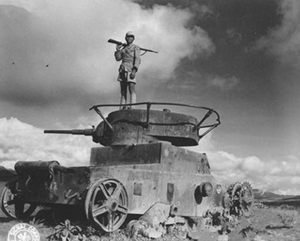 3.一名中国卫兵站立在一辆破旧的坦克残骸上警戒放哨。