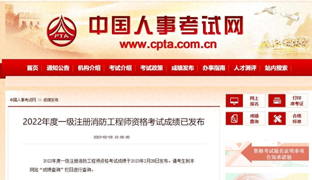 根据中国人事考试网官方公布的最新消息,2022年一级注册消防工程师成绩于2023年2月28日公布!