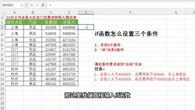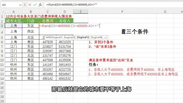 ·首先就来输入并列三条件的公式写法。这里直接输入if函数,然后是三个条件要同时满足。在excel中有通过if函数能够将多个条件进行合并,这里条件写法就是总收,也就是第三要大于四百万,然后是总费用要小于四十万,最后就是城市要不等于上海。