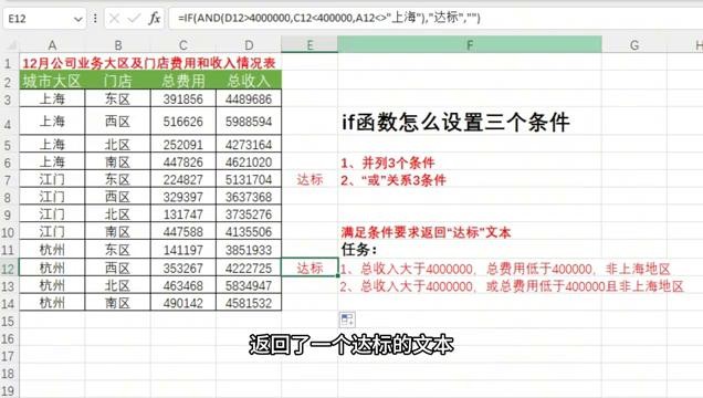 通过if函数进行了三个条件的合并,此时作为if函数的第一参数,当它成立时要返回一个达标文本,所以第二参数就输入为达标,否则要返回第三参数。这里直接设置为一个空值。