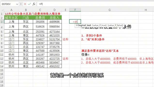 ·接下来再看一下它的或关系三条件。所谓或关系三条件也就是并不需要全部满足所有的条件,只要其中有任意的条件能够满足,就会返回所设定的文本结果。这里任务是总收入要大于四百万,或者是总费用低于四十万且非上海地区就能返回一个达标的文本。