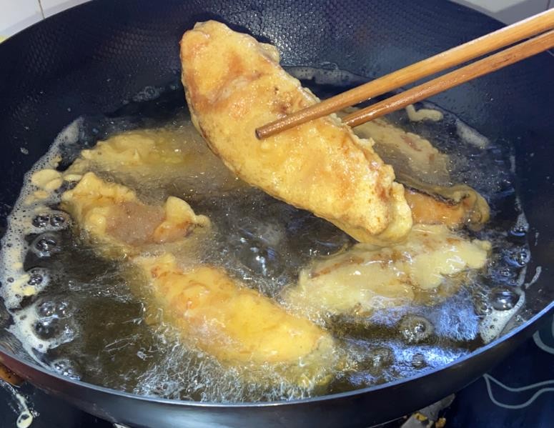 接下来,热锅冷油,将油烧至五成热,将裹好面粉糊的鱼肉放入油中,小火慢炸,炸至表面金黄酥脆,即可捞出控油。