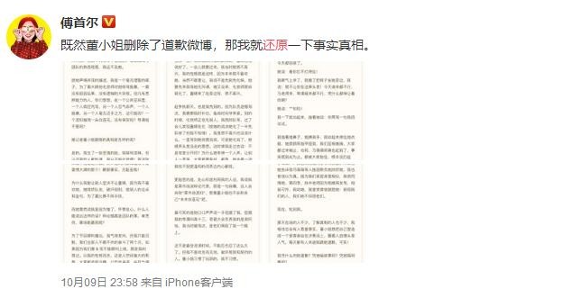 随后,傅首尔再微博发文称:“在忍受烂人的过程里,没有成长,只有膈应。”“很想知道小人宣扬真善美宽容和爱的时候是什么心态,给自己洗脑了吗?”言辞犀利,疑似回应董婧的爆料。