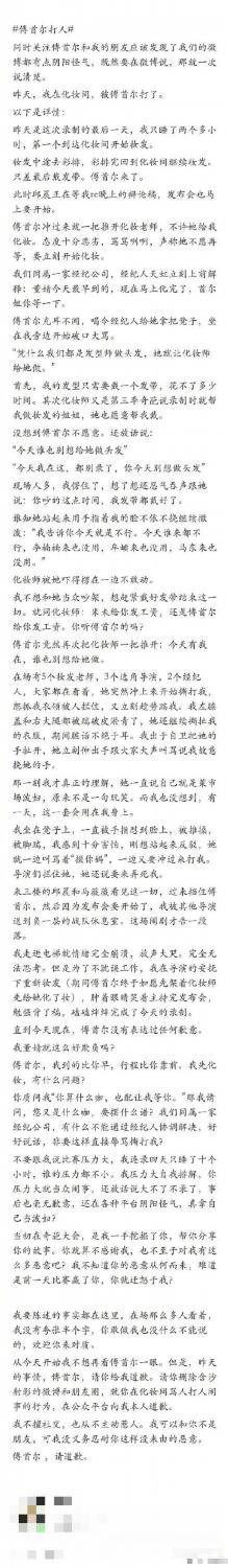 《奇葩说》选手傅首尔发文还原当日与董婧打骂事件的过程,否认是自己单方面辱骂殴打。表示当日自己先到化妆间,在时间紧张的情况下等待董婧化妆,但对方却在妆面完成的情况下依然要化妆师继续做头发,并口吐脏话,两人进而争吵推搡起来,最终被大家劝住。