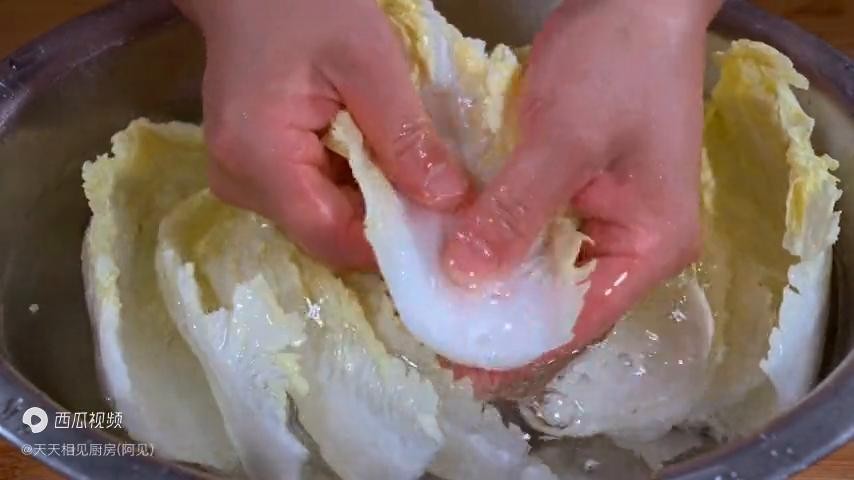 10. 这时候娃娃菜也腌的差不多了,变软了许多,往里面加入多一些的清水,把娃娃菜表面的食盐清洗一下,清洗好以后控干水分放入大碗中。
