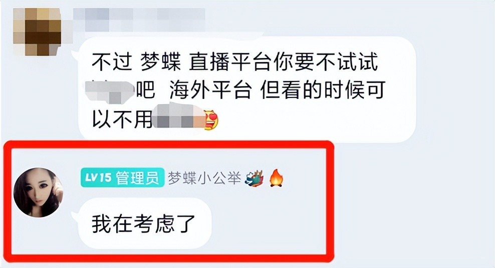 而最近,复出之心不死的梦蝶小公举又开始打起了海外平台的主意,原因则是她群里有网友跟她说了轩子复播的情况。