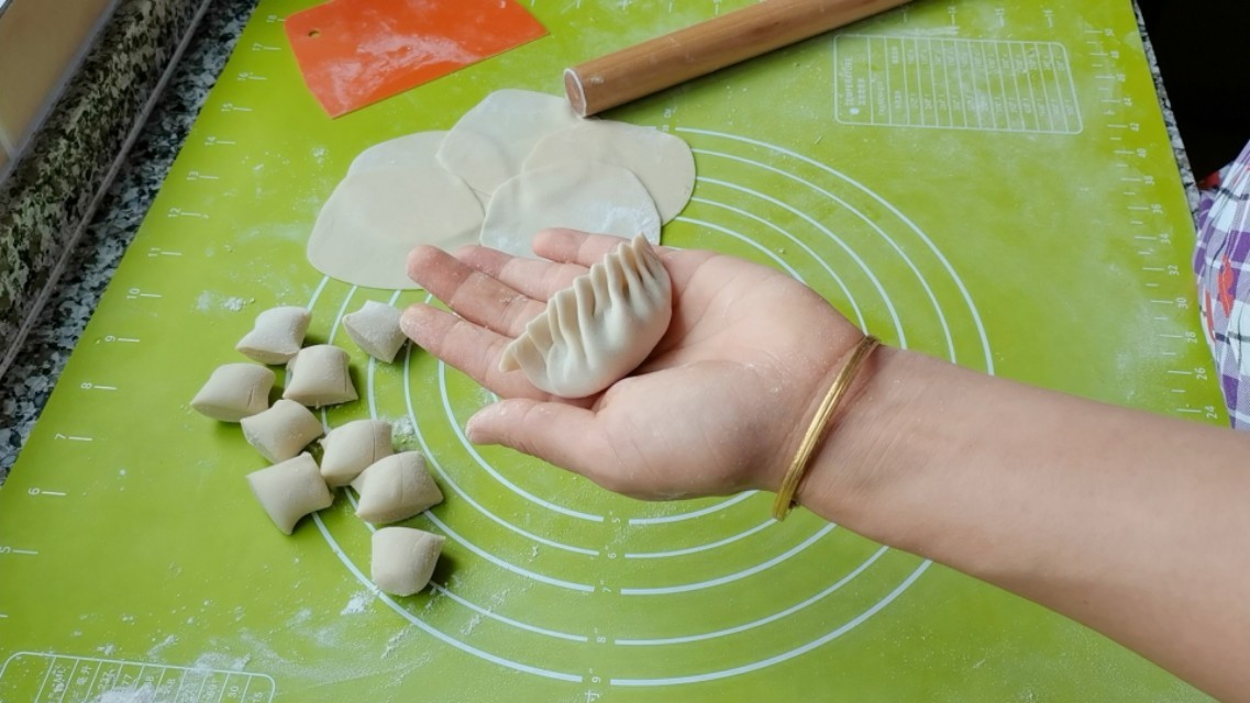 4,将每块面团,擀成圆饼,擀成饺子皮厚度或者混沌皮厚度都行,放入馅料,按你喜欢的样子包好收口。