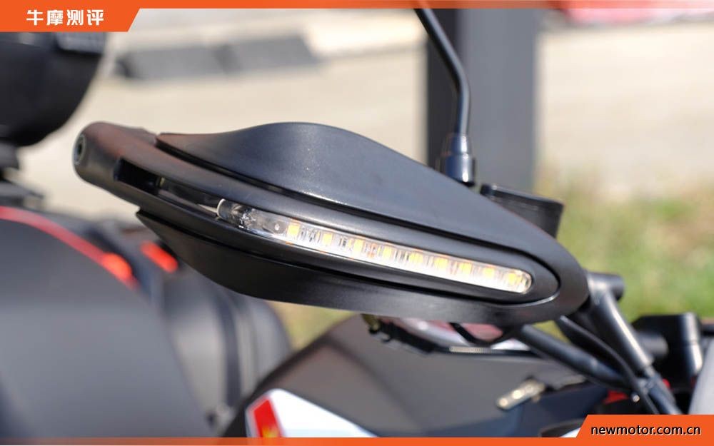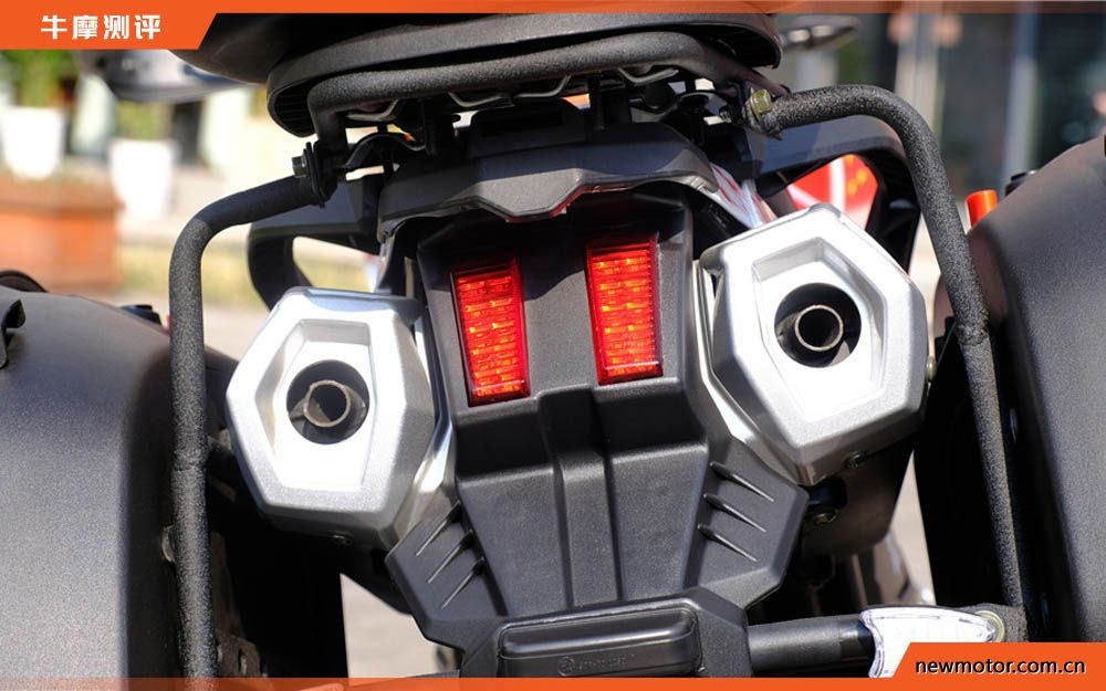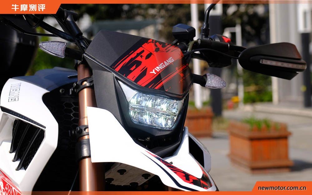 车头的短鸟嘴设计,高位挡泥板,在视觉上与车头大灯,仪表连成一体,又因为没有风挡的关系,有了越野车的风格。国四版在换装LED大灯后亮度得到了很大的提高,官方说是5万照度,我开灯试过,确实很亮,方便夜间骑行。