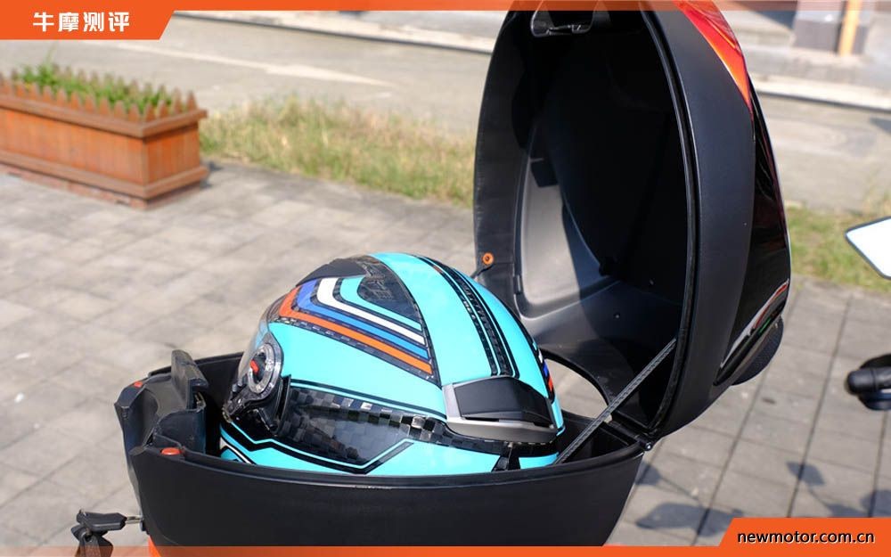 后尾箱实测可以放下一顶全盔的同时空间上仍有一定的富裕,还可以放些诸如手套之类的东西。