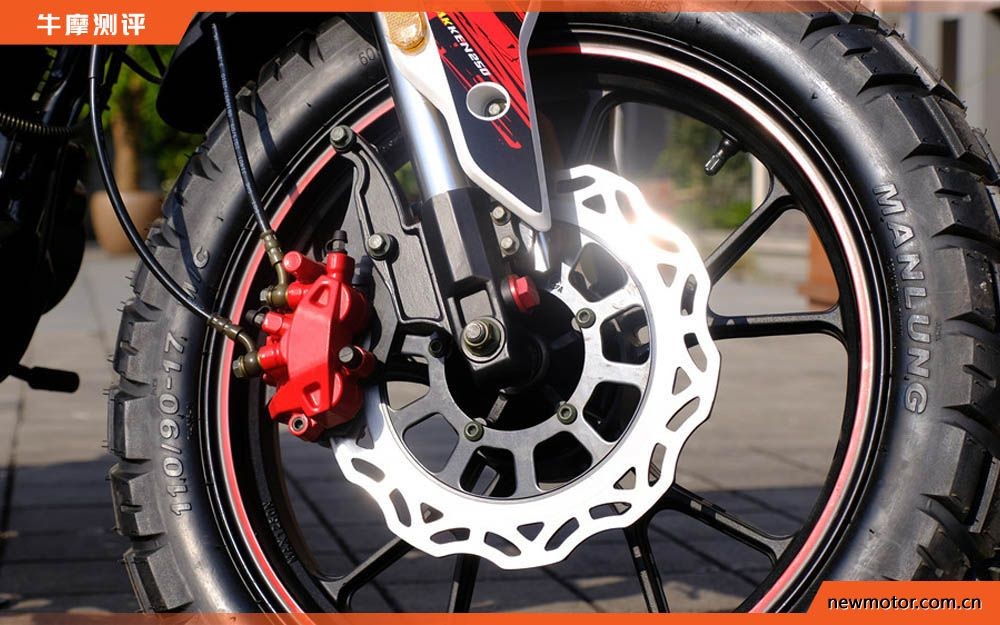 制动方面,前后盘式刹车,前盘搭配双活塞卡钳,后为单活塞卡钳。