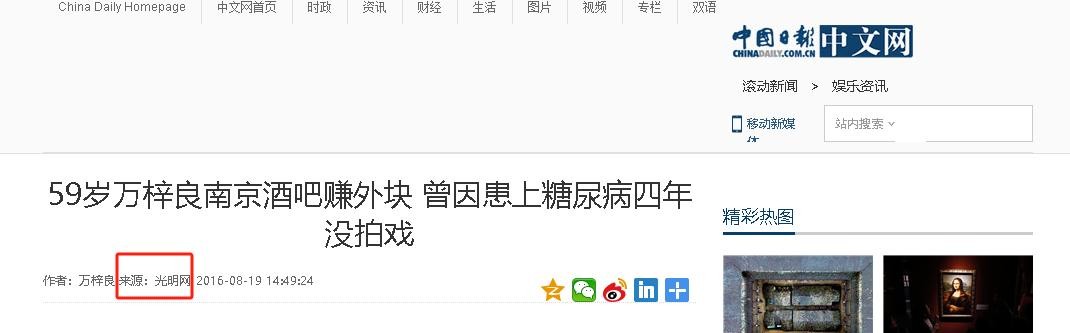 【2】《光明网》:59岁万梓良南京酒吧赚外快 曾因患上糖尿病四年没拍戏 2016-08-19