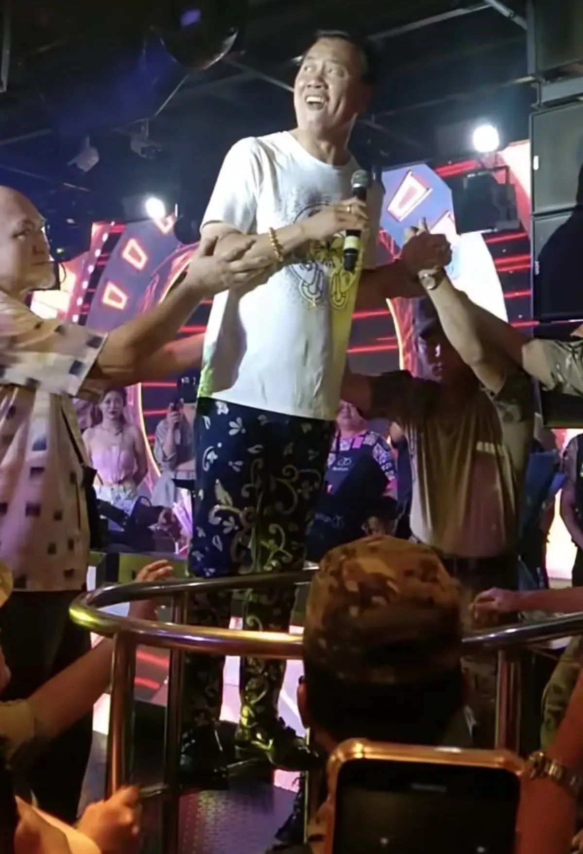 但是说他落寞吧,他的手腕上还有胳膊上都带有金手镯和戒指,可如果说飞黄腾达吧,这么大年纪了,孩子也都长大了但还得整天接商演挣钱,一点辉煌的影子都看不见。