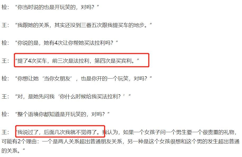 在庭审现场,辩方还是围绕了一个中心点进行正问,女受害人与王晶到底是什么关系,两人怎么结识的,王晶的回答是通过朋友认识,项目没有经过招标的方式,直接给了女受害人。另外辩方还问及了王晶女受害人是否索要过法拉利跑车,王晶的回答是的,并且索要了4次,头一次王晶以为女受害人在开玩笑,并且还帮助女受害人与剧组的道具法拉利跑车合影。