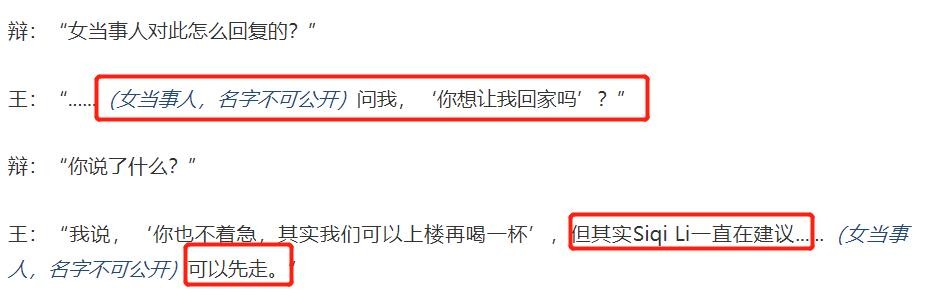 而两人在KTV中拥吻的细节,在之前的证人口中已经可以知道两人是你情我愿。后来在唱K结束之后,王晶还主动提议女受害人可以先走,理由是“你已经结婚了”。但是女受害人的反应却出乎意料,对王晶的劝告非常不在意,甚至有点不耐烦。