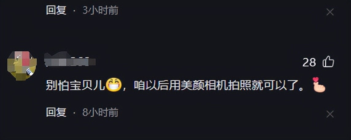 有网友以幽默的语气表示:“别怕宝贝儿,以后用美颜相机拍照就可以了!”这种调侃或许是为了减轻紧张氛围,但也反映出人们对自身外貌的不满和焦虑。在这个社交媒体盛行的时代,人们更加关注外貌,试图通过各种手段改善形象。然而,是否真的需要整容来解决这些问题呢?
