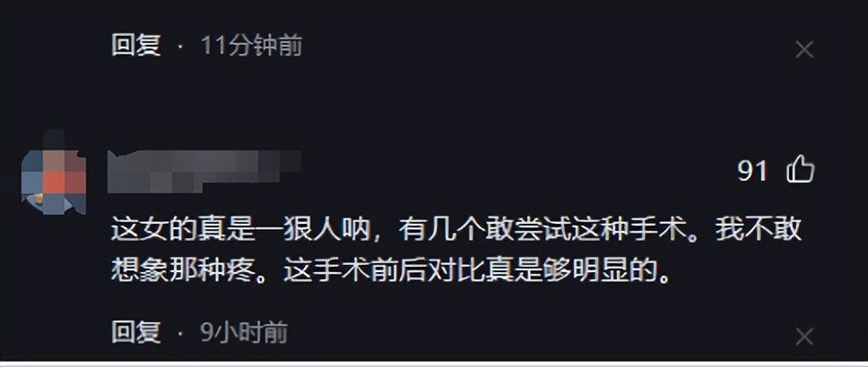 另一位网友则表示担忧:“这女的真是一狠人呐,有几个敢尝试这种手术。我不敢想象那种疼。”这种观点突出了整容手术带来的疼痛和风险,面容是每个人的独特标志,改变它需要慎重考虑,天然的才是最好的,所有后天改变的面容都是没有感情的,还存在很大风险与痛苦,何必自己为难自己呢?