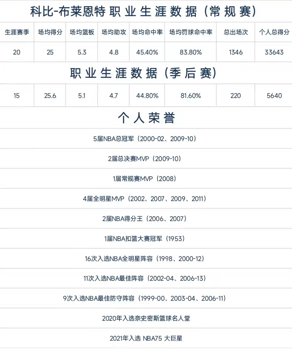 科比-布莱恩特职业生涯20个赛季,共获得5届 NBA 总冠军,2次奥运会冠军,2届总决赛 MVP,1届常规赛 MVP,4届全明星 MVP,1届扣篮大赛冠军,16次入选 NBA 全明星阵容,11次入选 NBA 最佳阵容,9次入选最佳防守阵容。