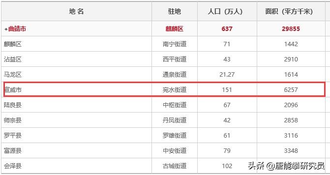 宣威有151万人,6257平方公里,双双位居曲靖第一。