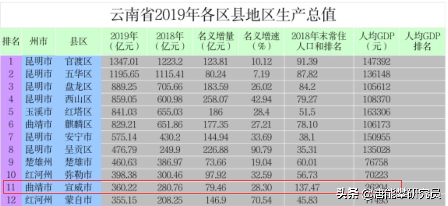 从上面的云南省2019年县市区GDP排行可以看出,除了省会昆明的5区1市(安宁市)之外,宣威的GDP仅次于玉溪市府红塔区、曲靖市府麒麟区、楚雄州府楚雄市、红河州的弥勒市,位居全省第11名,力压红河州的州府蒙自市(第12名)。
