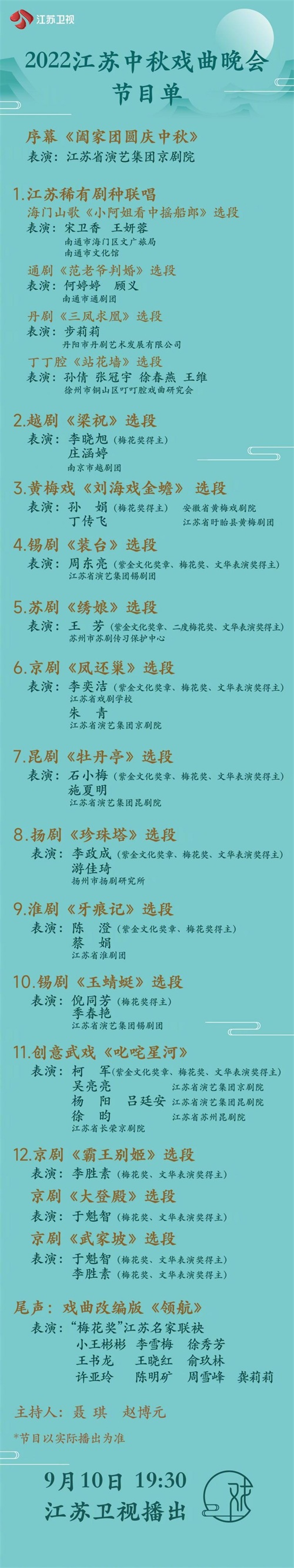 9月10日中秋月圆之夜,《2022江苏中秋戏曲晚会》与观众见面。本台晚会云集京剧、昆剧、锡剧、扬剧、淮剧等戏曲剧种,邀请多位获得过“紫金文化奖章”“梅花奖”“文华表演奖”等重大奖项的戏剧界领军人物,带来经典名段,品位戏曲艺术魅力。