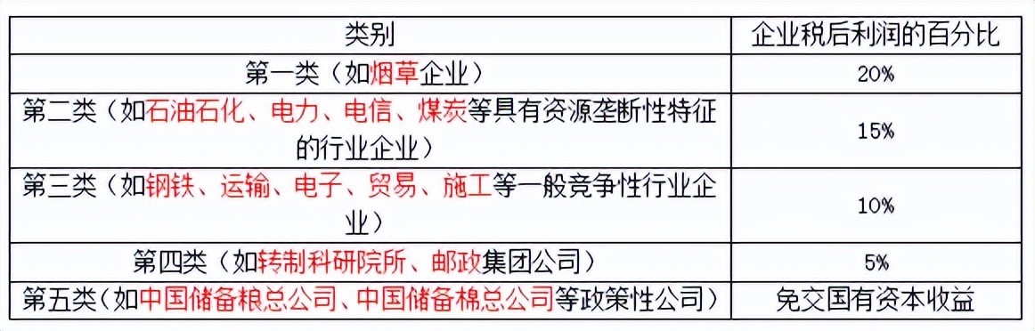 ②国有资本收益收取比例分为五类执行
