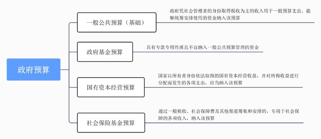 按照建立与社会主义市场经济体制相适应的公共财政制度的要求,我国完整的政府预算体系包括一般公共预算、政府性基金预算、国有资本经营预算和社会保险基金预算。其中一般公共预算是政府预算体系的基础。