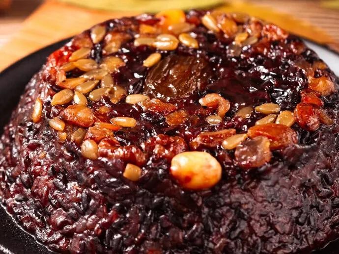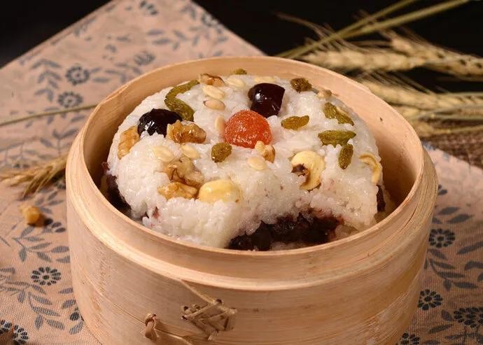 【辅料】:花生油50克 白砂糖50克 红绿丝20克 瓜子仁15克 葡萄干20克 蜜枣(无核)30克 核桃肉20克 红枣20克