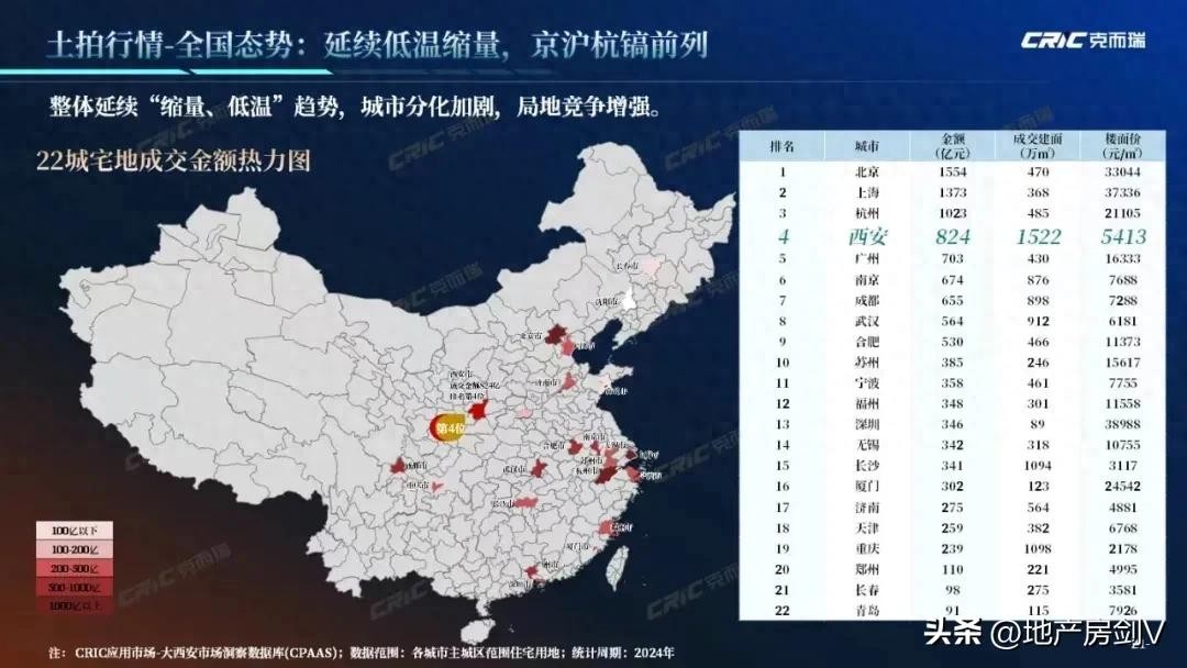 昨天,克尔瑞发布了2024年度西安房地产市场研究报告,并在这份报告中公布了2024年全国22城的土拍数据。