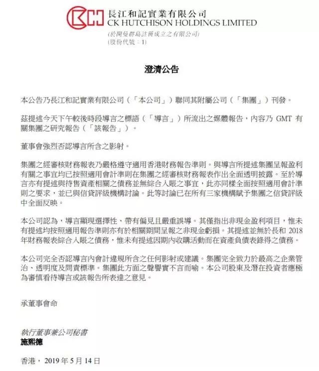 北京时间14日晚间近23点,长和发布澄清公告称“强烈否认”。公司称,经审核财务报表是严格遵守适用香港财务报告准则的。