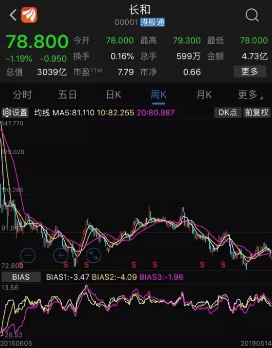 受消息影响,长和正股价格早盘一度以78港元价格低开,但随后有多头介入,全天以78.8港元收报,下跌1.19%。