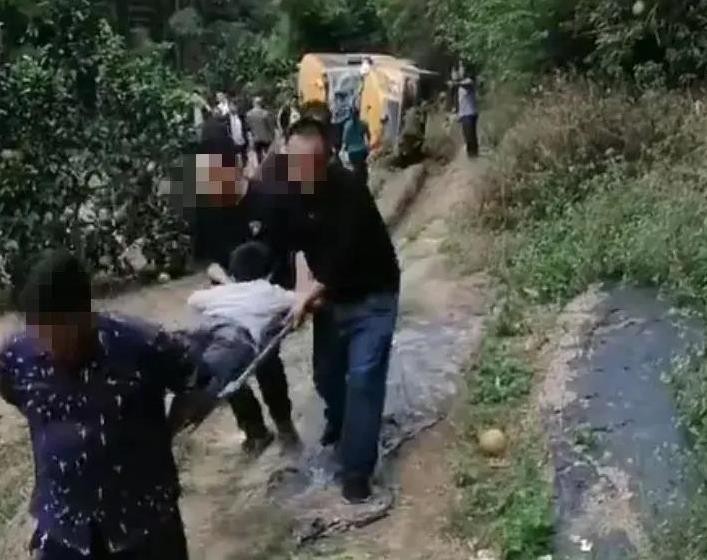视频显示,校车在坡脚处倒塌,附近村民正在参与救援工作。孩子们被担架抬着,校车旁边躺着人们。那里有很多救援人员。