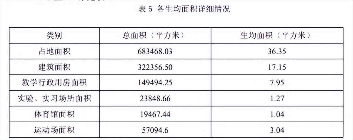 据学校《2020-2021学年本科教学质量报告》,学校总占地面积 68.35 万平方米,在校本科生16240 人,生均占地面积离教育部规定的生均60平方米以上还相差太远。当然,校园占地面积相差太远,校园建筑面积(标准:生均30平方米)和教学行政用房面积也是跟着相差太远的。