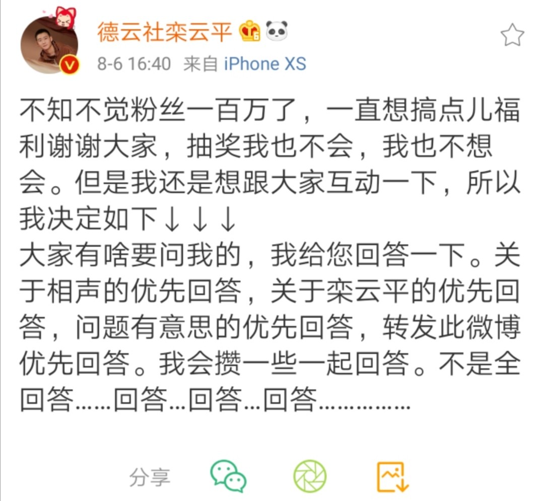 虽然现在栾云平有了170万粉丝,可他临时抽浪风,突然想起自己的粉丝达到一百万时,没发福利。