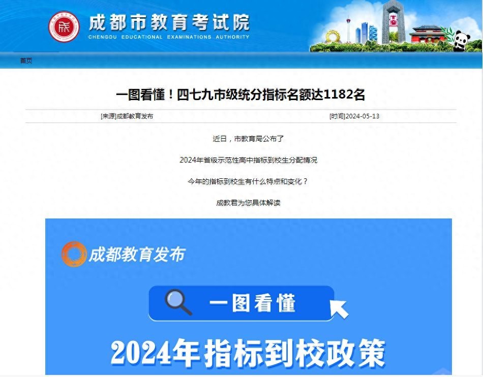 日前,成都市教育局发布了2024年省级示范性普高指标到校生分配情况,5月13日,成都市教育局官方微信公众号也详解介绍了2024年指标到校政策,并以“一图看懂”的形式周知广大家长。