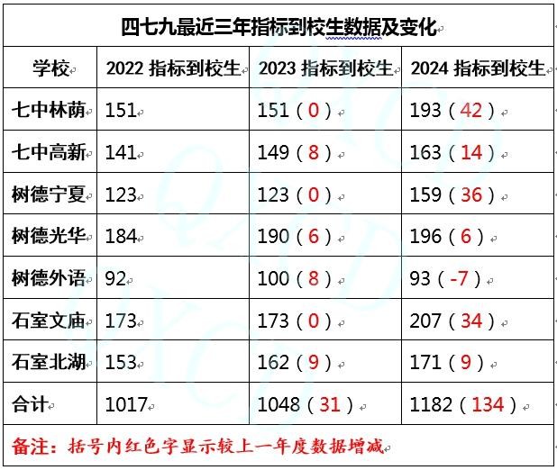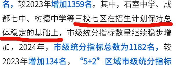 从上表可以看出,2023年相较于2022年四七九指标到校生的名额并没有太大的变化,各校的增量都是“个位数”,可以理解为“挤出来”的。但2024年相较于2023年就是大飞跃了,不仅总量增加了134个名额,而是除了树德外国语校区是减少7个名额外,其余6校区都有增加,更有四个校区的增值达到了“两位数”——四七九的三个主校区(石室文庙、七中林荫、树德宁夏)的增量更是分别高达34、42、36。