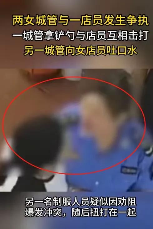 随后执法人员拿起另一个铲子击打女店员,女店员随即还击,另一名执法人员劝阻时,与女店员扭打在了一起。