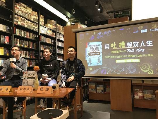 我们常常会羡慕别人说话有趣。《吐槽大会》《脱口秀大会》成了当下很多年轻人喜欢和追捧的节目。幽默正成为一种社交能力,竞争力。但怎么让自己更有幽默感,让自己的“吐槽”得到欢乐的效果,却是一门需要训练的技术活儿。幽默,脱口秀,吐槽,也是有一定技巧,有套路的。喜剧大师格雷格·迪安曾经专门写过一本书《手把手教你玩脱口秀》,专门从可操作的层面,分析笑话结构的三大机制,并从排练方法到表演技巧,从麦克风使用到增加舞台经验,可谓是“手把手教”人说笑话,提高幽默感。近日,这本书也被翻译引进到国内出版,其中两位译者正是国内当下最热门的脱口秀节目《吐槽大会》的编剧程璐、梁海源。3月25日,这两位在网络上有很高人气的喜剧编剧,携带这本喜剧宝典,来到成都西西弗书店,与四川读者分享他们在《吐槽大会》节目中为明星写“吐槽”段子幕后的故事,并现场分享了如果在耍幽默冷场时救场,以及提高幽默能力的小技巧等。现场笑果十足,一场图书分享会,也成为一场落地版的吐槽大会。