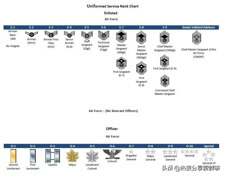 因此,无论您不知道任何军衔,还是只是对如何排列军衔感到困惑,以下是每个军衔的军衔结构细分,从最低入伍的工资等级开始,然后向上提升至最受委派的最高官员。此列表包括陆军、空军、海军、海军陆战队和海岸警卫队的军衔。目前,太空部队主要由利用空军军衔结构的空军人员组成。