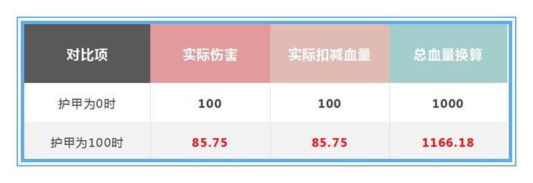 我们将数据列出来后再分析,可以发现,当血量为1000时,100点护甲相当于可以增加166点血量。