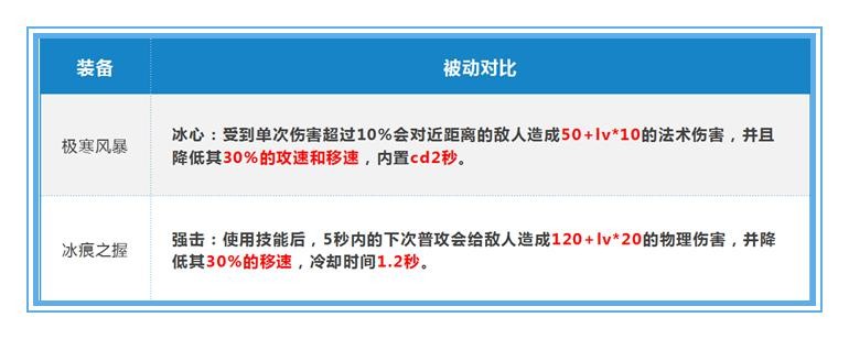 极寒风暴的冰心被动想要触发,必须要先挨打;冰痕之握的强击被动要想触发,必须要先使用技能。极寒风暴的被动伤害为50+等级×10的法术伤害;冰痕之握的被动伤害为120+等级×20的物理伤害冰心被动cd为2秒,冰痕之握的被动cd为1.2秒。