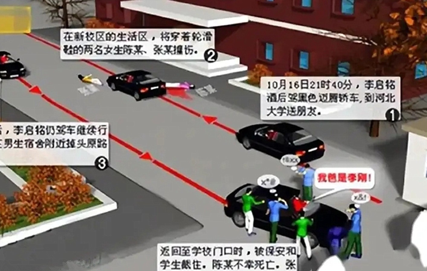不幸的是他的鲁莽行为很快造成了严重后果。在一次急转弯时,车速过快的李启铭撞倒了两名女学生,事故发生后他没有停车处理,反而加速逃离现场。周围的学生目睹了这一切,立刻有人拨打120叫救护车,同时联系校保安。