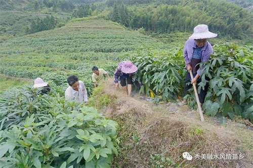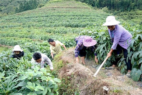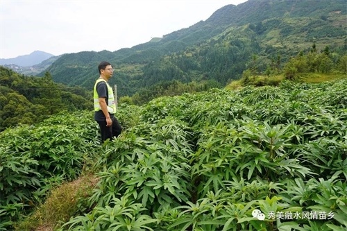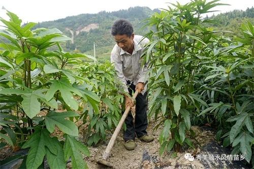“我家今年种植22000多株牛奶根,有25亩左右,两年后每株以3斤计算,收入就有来算咯”正说话间,一村民从绿浪里“冒”出来搭讪。他叫荣老四,依靠种养勤劳致富,去年一家人实现脱贫摘帽,现在成为村里的致富带头人。这几天,趁着好天气,荣老四和其他村民一样,大伙都到地里给牛奶根除草、松土、施肥。春栽夏种冬管,一年除草8次,对栽下的每一株幼苗,像对亲人一样呵护。
