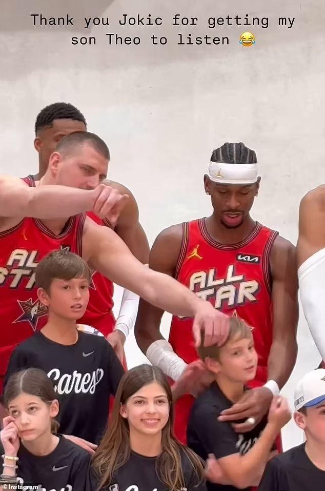 不过照片中,丹佛掘金队的塞尔维亚中锋尼古拉·约基奇(Nikola Jokić),正用大手触碰西奥多的脑袋,并提示他向前看。