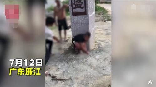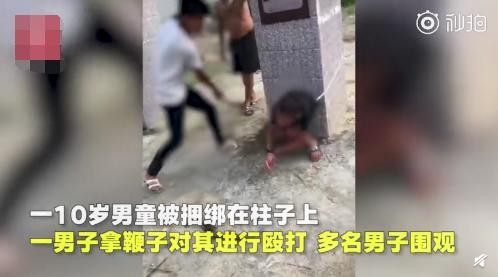 7月12日,广东廉江,一名10岁的小男孩被绑在柱子上,另一名穿着白色上衣的男子拿鞭子对其进行殴打,周围还有多名男子围观。小男孩惨叫连天,嘴里一直喊着:我没拿,我没拿。