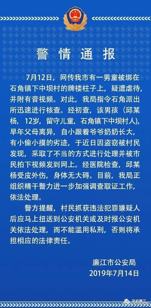 据廉江市公安局#警情通报#:经初查,12岁留守儿童邱某杨,于近日因盗窃被村民发现,被采取不当方式进行处理。经医院检查,邱某杨受皮外伤,身体无大碍。目前正在进一步加强调查取证工作,依法处理。