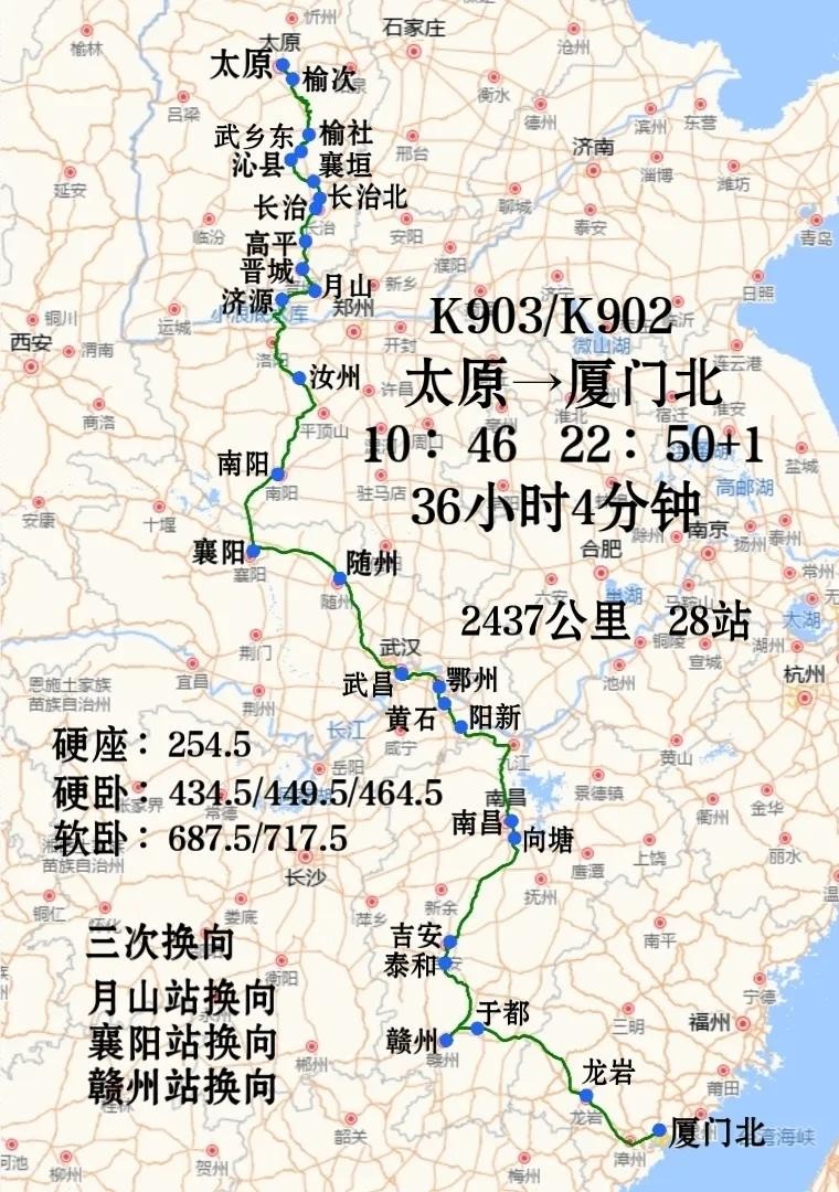 太原到厦门唯一一趟绿皮火车:K903次,太原站开往厦门北站,这趟车的线路非常曲折,经太焦铁路、焦柳铁路、汉丹铁路、京九铁路、赣瑞龙铁路、龙漳铁路、杭深铁路运行,2437公里,途径山西省、河南省、湖北省、江西省、福建省。
